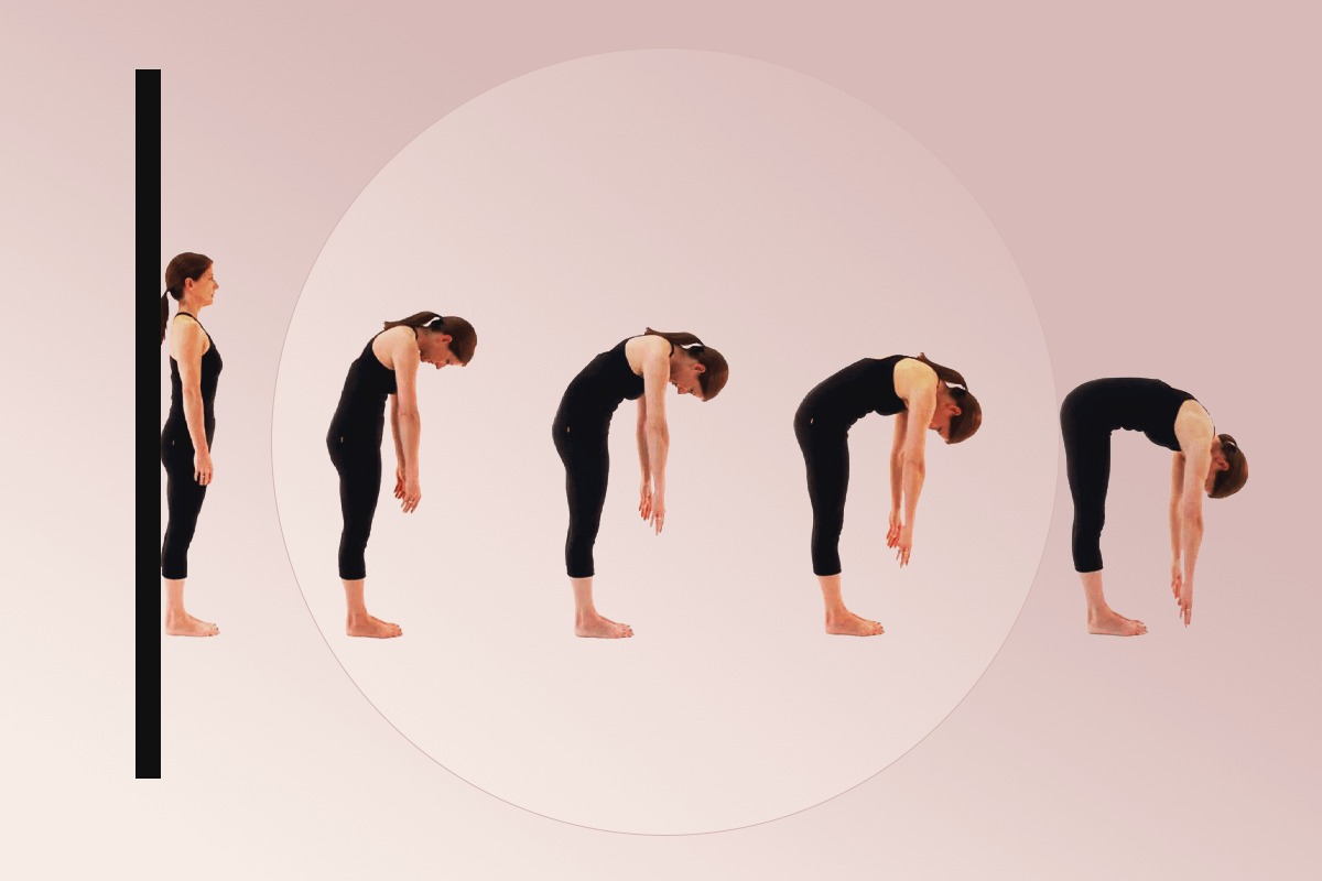 - кивни и начни медленно скручиваться вниз, опуская позвонок за позвонком;
