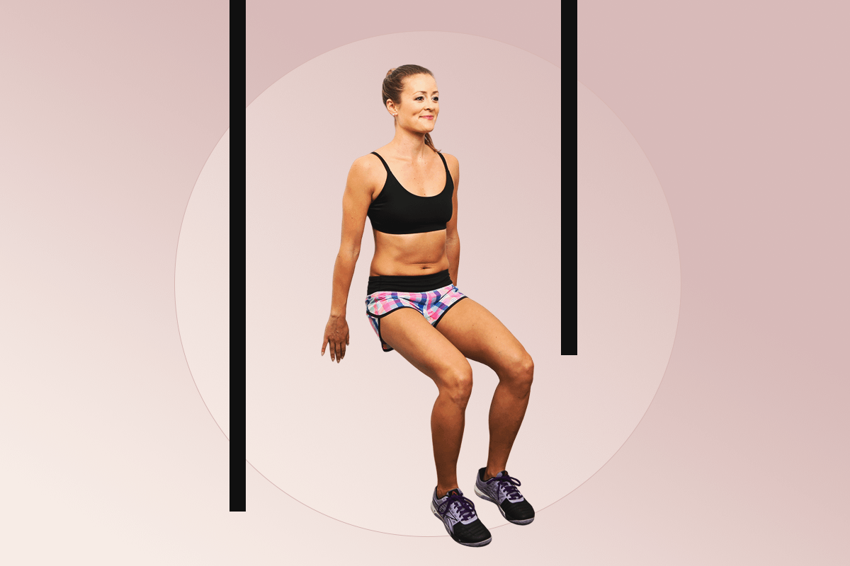 - присядь, чтобы бедра были параллельны полу, а угол в коленях — 90 градусов;