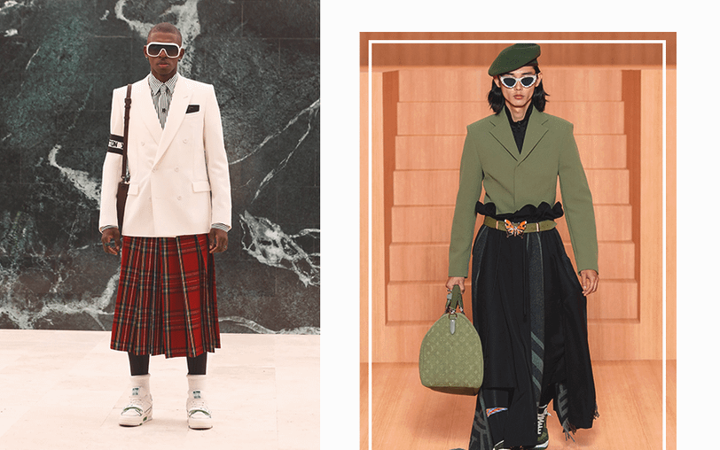 А Вирджил Абло для мужской коллекции Louis Vuitton осень-2021 создал не один образ с килтами: в его интерпретации, переосмысливающей маскулинность, появились как классический клетчатый килт, так и зеленый килт с диагональным кроем. В его шоу весна-2022 также вошла мужская клетчатая юбка в пол. В своей фантазии Абло лишил все гендерные стереотипы власти, напоминая о том, что символы мужественности мы вправе выбирать сами. Именно новые архетипы, считает Вирджил, способны наделить нас силой, а жесткие формы, теряющие свою актуальность, только ограничивают.
