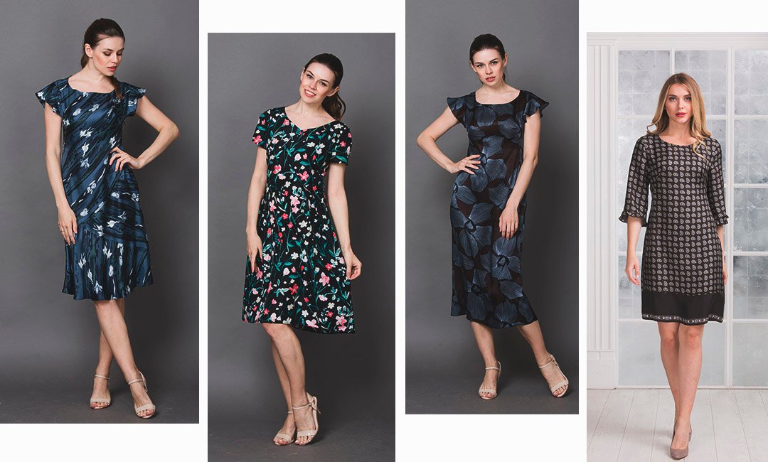 Для дневных прогулок подойдут платья с контрастными принтами. Присмотрись к приталенным силуэтам или фасону «трапеция», а также к платьям из плотного итальянского шелка. Интересно будут смотреться модели с фигурной линией низа юбки, с оборкой на рукавах и игривым цветочным принтом.