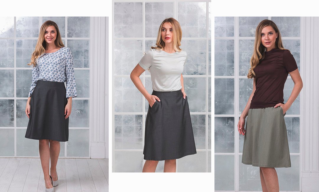 Еще один универсальный вариант — платье длиной выше колена в серых оттенках с карманами и отрезным лифом. Любительницам платьев простого классического кроя стоит обратить внимание на элегантное черное с овальной горловиной или светло-коричневое платье с кокеткой и манжетами в тон основной ткани.