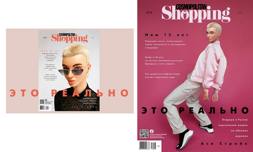 Печатное издание Cosmopolitan Shopping стало первым в России, кто использовал цифровые технологии, чтобы совместить бумажные носители и виртуальную реальность. На обложке юбилейного выпуска журнала появилась русская виртуальная модель Ася Страйк.