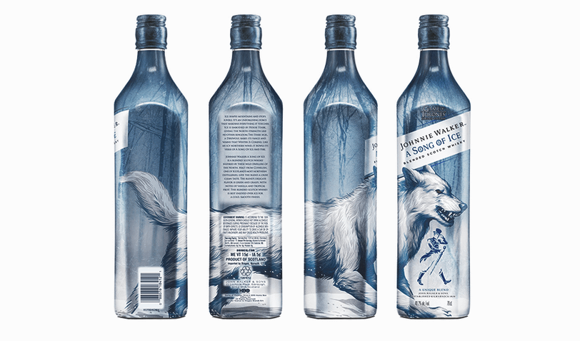 Виски Johnnie Walker A Song of Ice («Джонни Уокер — Песнь Льда») с крепостью 40,2%, бутылка которого выполнена в синем цвете и напоминает о королях Севера — Старках, содержит вкус трав с нотами ванили и тропических фруктов. Для изготовления этого виски использовался солод одной из самых северных винокурен Шотландии — Клайнлиш.