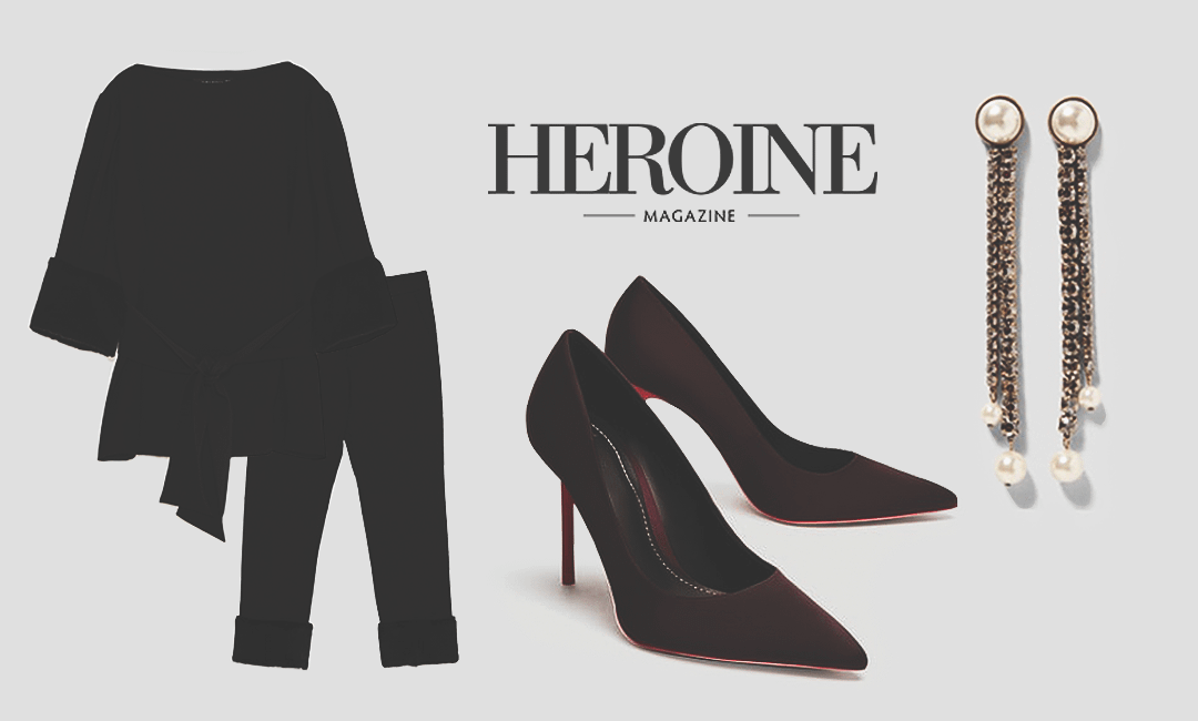 В Zara нашелся отличный вариант – черный костюм с отделкой из искусственного меха. Это же просто бинго: тут тебе и наряд, и трендовые меховые манжеты. Лодочки из бордового атласа, потому что нейтральные цвета требуют порочной компании.