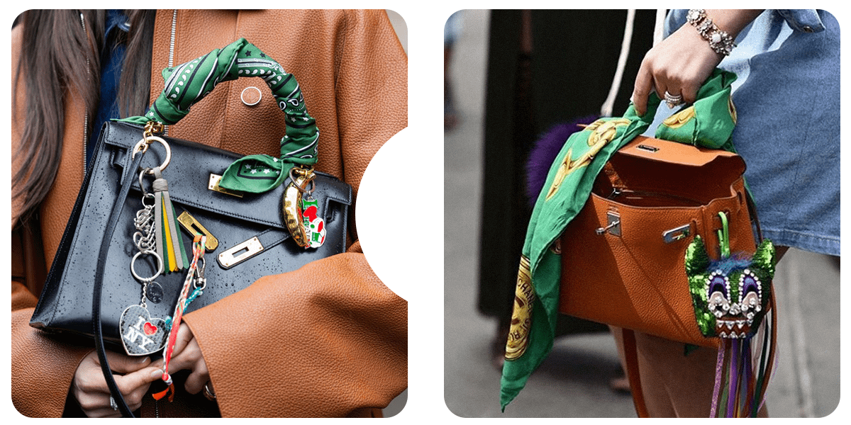 Чтобы придать сумке уникальный и стильный вид, сочетай подвески с шейным платком, небрежно повязанным на ручку или обмотанным вокруг нее.