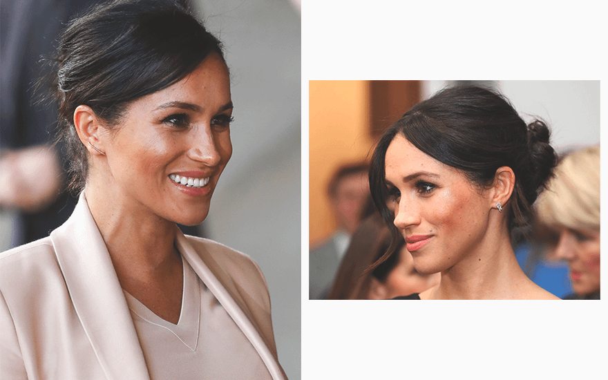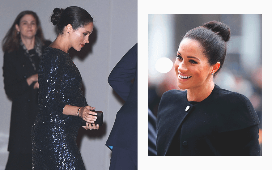 Меган любит, когда из прически выбиваются пряди и падают ей на лицо, но иногда для более официального стиля она делает гладкий и фиксированный пучок. Так она выглядела во время визита в Ирландию, на британской неделе моды или на представлении Cirque de Soleil. Такой пучок хорошо сочетается с длинными вечерними платьями.