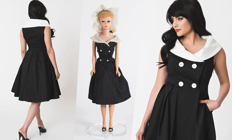 Эта версия платья для Барби 1961 года в натуральную величину привлекает внимание сложным покроем и яркостью. Рукава-капюшоны, квадратный вырез и юбка-карандаш отлично передают стиль самой красивой куклы в мире.