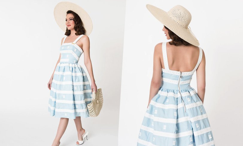 Это платье навевает мысли о Барби-домохозяйке и представляет собой репродукцию самого популярного сарафана, выпущенного еще в 1959 году. Очаровательное белое платье в голубую полоску украшено кружевами, вышивкой в форме цветов и подчеркивает фигуру в соответствии с пин-ап стилем.