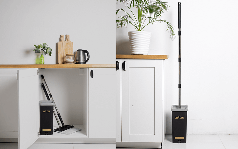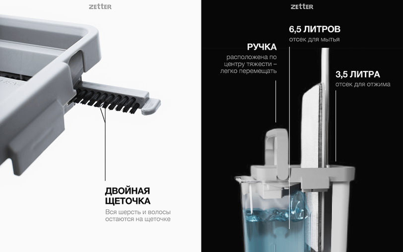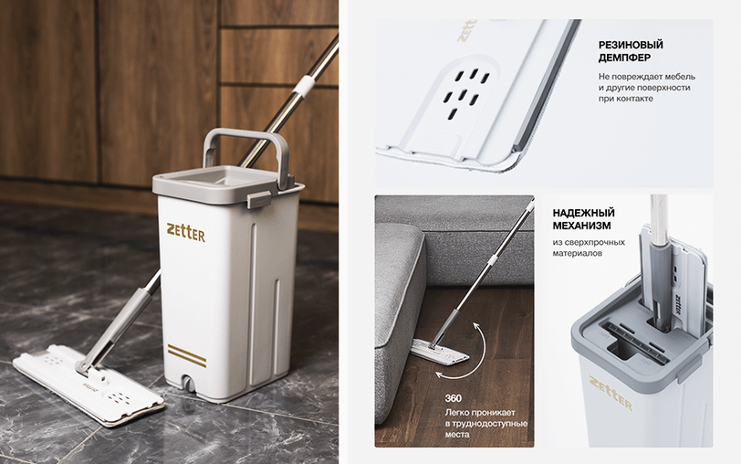 Система уборки от Zetter как раз такая: их швабры почти на 20 см длиннее, чем у аналогов. При уборке тебе не придется наклоняться. Ведро разделено на отсек для мытья и отжима, подобрав объем под площадь квартиры, ты сможешь убрать все комнаты без смены воды и ни разу не дотронувшись до тряпки.