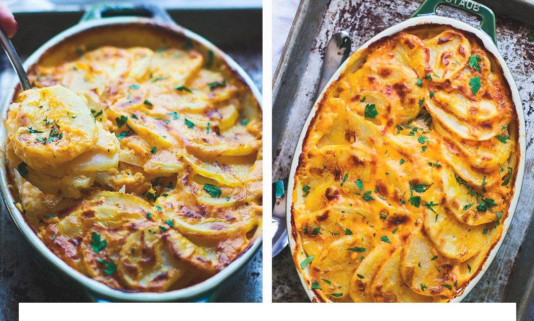 Выложи ломтики картофеля на противень тонким слоем. Засыпь тертым сыром и залей соусом. Повторяй на каждом уровне, пока не заполнишь весь противень. Запекай, пока картофель не станет мягким, а верхняя корочка — золотистой.